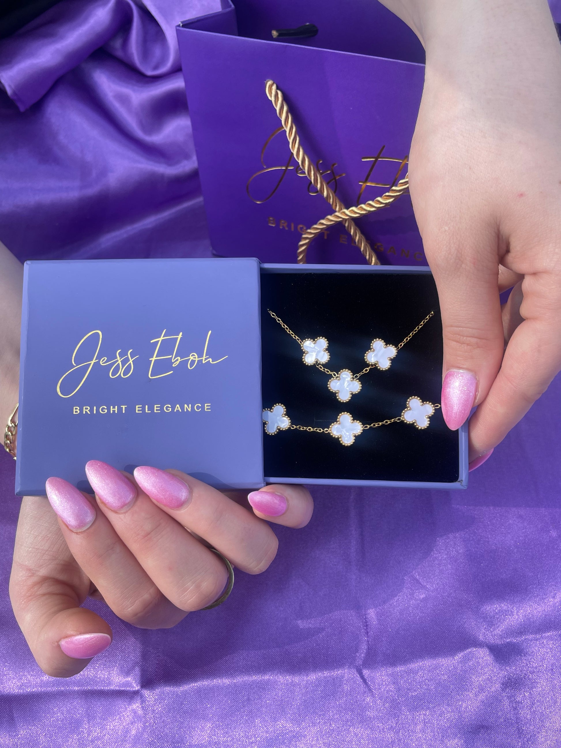 Experience luxurious elegance with our Clover 18K Gold Plated Set. Crafted with stunning 18K gold-plated stainless steel, this set includes a necklace, bracelet, and earrings for a complete look. The 18K gold exterior plating adds a touch of sophistication, while its waterproof feature ensures long-lasting wear.