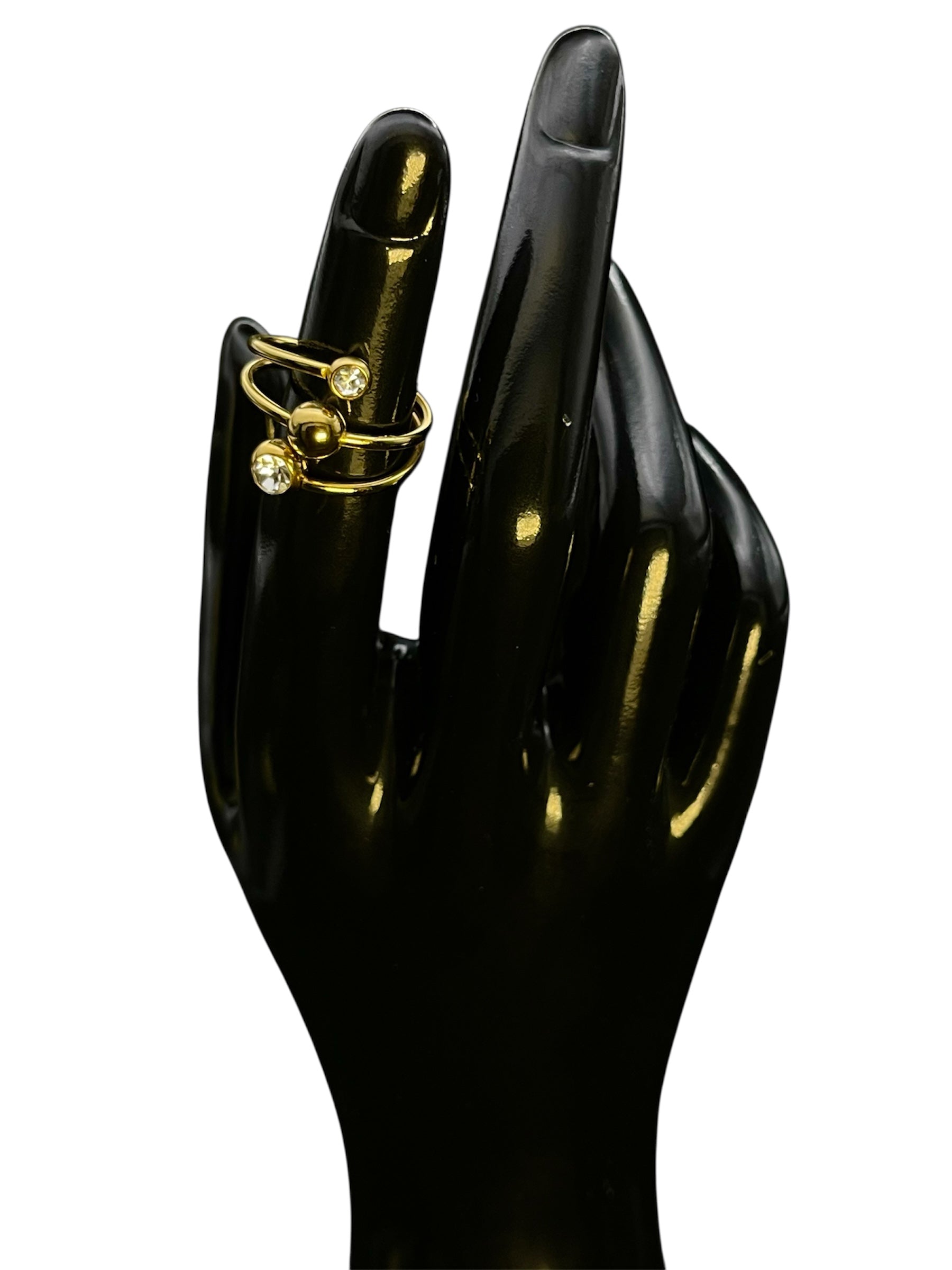 This triple ring is made of 18K gold and features two sparkling cubic zirconia stones. Luxurious and elegant, this ring is the perfect addition to any jewelry collection. Made with top-quality materials, it guarantees both style and durability.