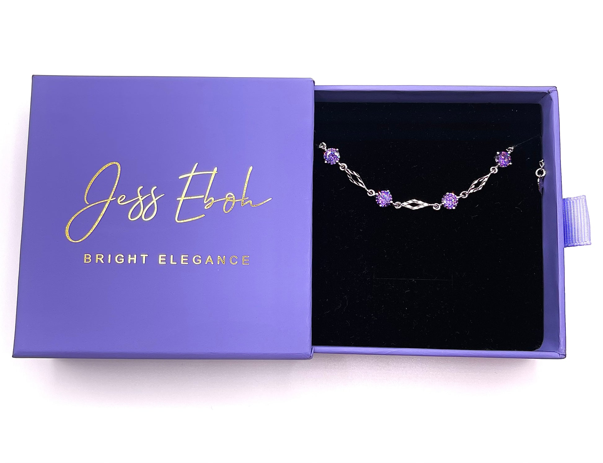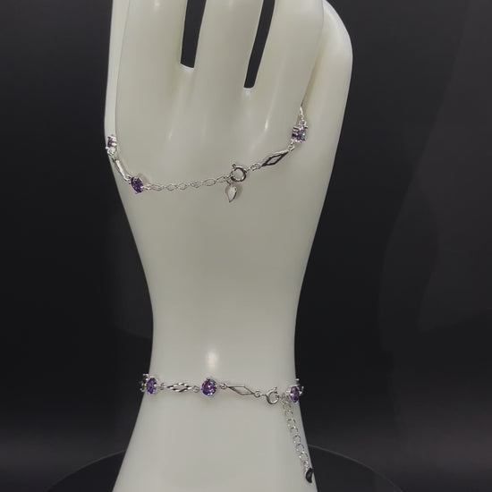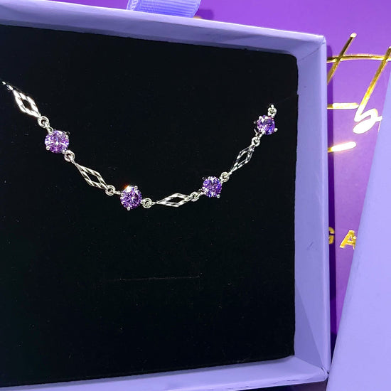 Indulge in elegance with our silver bracelet featuring stunning purple crystals. Elevate your style effortlessly.